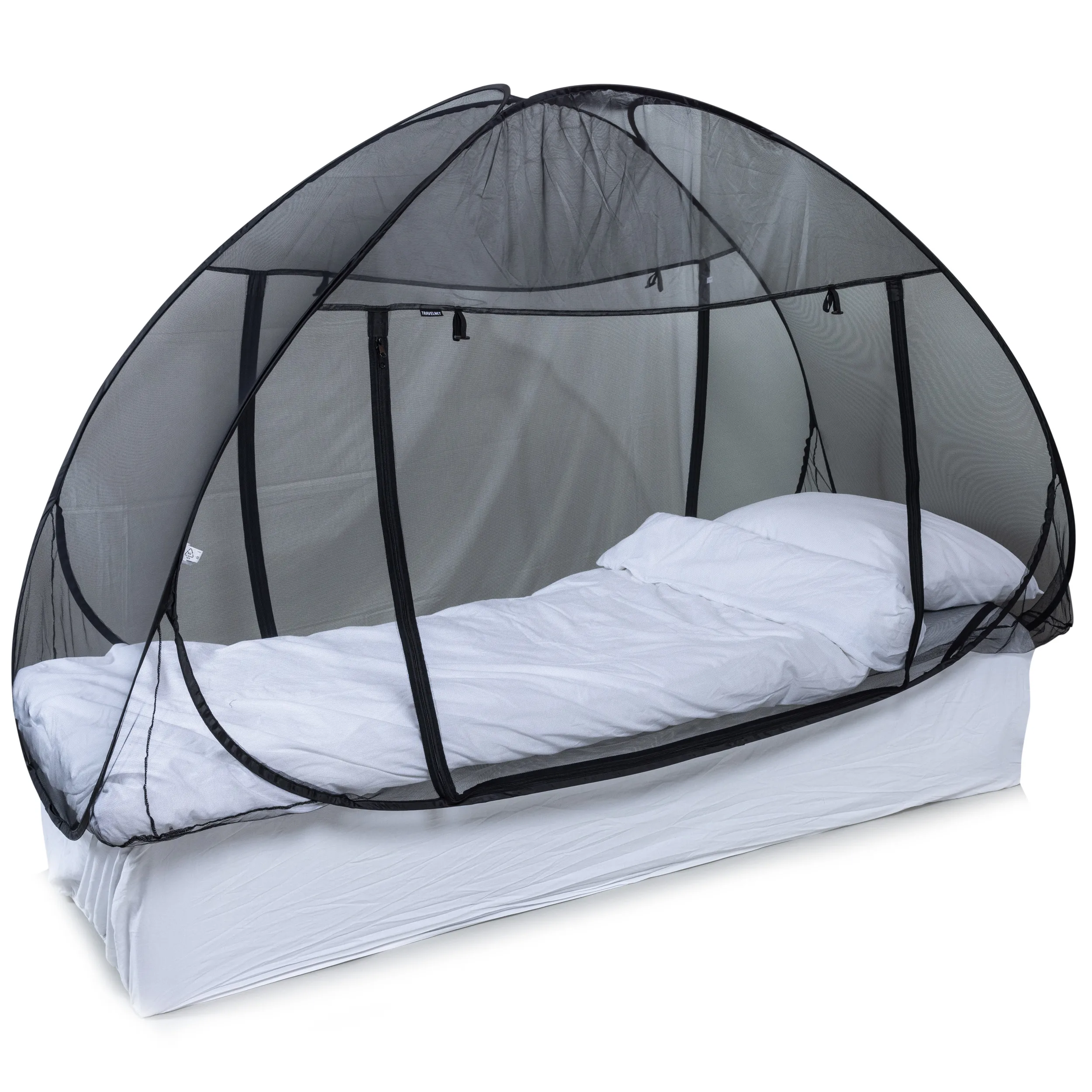 Deconet Pop-up klamboetent I, zwart, 1 persoons, de ideale klamboe tent speciaal ontworpen voor een 1-persoonsbed waarvoor gaten boren en ophangen niet nodig is. De klamboe is geschikt voor bedden van 200cm lengte en 100cm breedte en heeft een hoogte van 120cm. De bodem is ook volledig gesloten dus ook vanuit de onderzijde kunnen er geen muggen of insecten naar binnen kruipen.