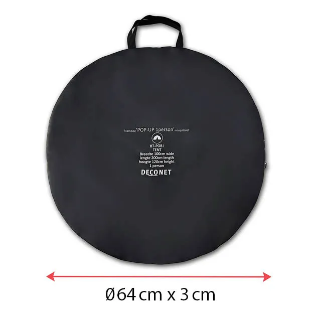 Wanneer de Deconet Pop-up Tent in de zak zit dan heeft deze een diameter van 64cm waardoor deze niet altijd in een koffer of reistas zal passen.