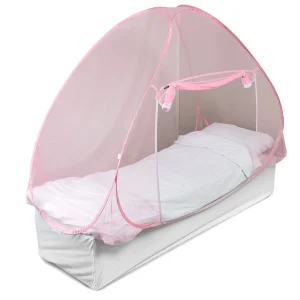 De Pop-up klamboe tent I, is in een handomdraai opgezet en met oefening zo weer opgeborgen om mee te nemen naar buiten of in de auto richting het vakantieadres.