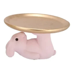 Vier Pasen in stijl met deze schattige konijnenschaal! Dit lieve konijntje ligt ontspannen op zijn rug en houdt een goudkleurig plateau omhoog, perfect voor het serveren van koekjes, chocolaatjes en natuurlijk paaseitjes. De speelse en charmante uitstraling maakt dit een echte eyecatcher op je paasontbijt of high tea.